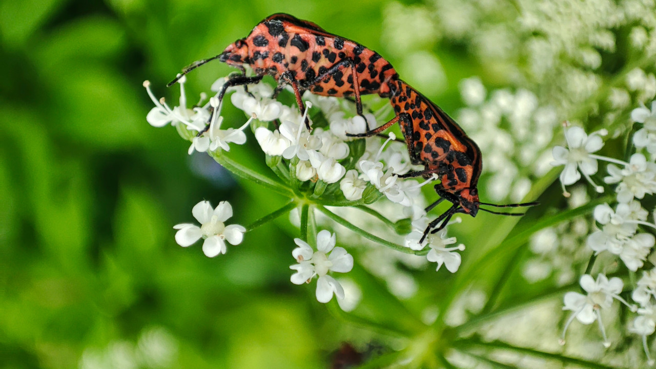 Ультракрупный план пары клопов с пятнистым красно-чёрным рисунком, соединённых в момент спаривания на белом зонтичном соцветии. В фокусе детали тела: сегменты, усики, лапки и пятна на надкрыльях; рядом заметны раскрытые цветки и тонкие стебельки. Фон растворяется в зелёном боке, что характерно для съёмки среди трав и кустарников в тёплое время года. Фотография подойдёт для материалов о жизненных циклах насекомых, биологии опылителей и полевых наблюдениях, а также для иллюстраций о природе. Использование: учебные пособия, энциклопедии, научпоп и экопросветительские проекты.