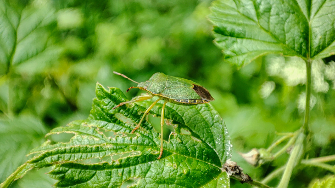 природа насекомые животный мир растения дикая природа биология энтомология биоразнообразие макросъёмка крупный план клоп щитник зелёный клоп полужесткокрылые насекомое на листе листва зелёные растения повреждённый лист следы питания садовые вредители огород лето тёплый сезон камуфляж маскировка текстура жилки листа селективный фокус размытый фон экология микромир наблюдение за насекомымиПохожие фотографии
