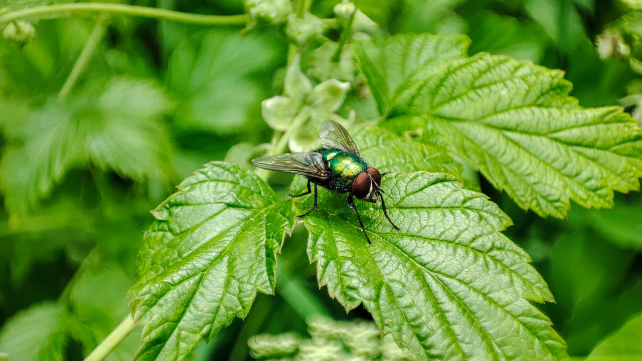 Муха с металлическим зелёным телом на листе растения, макросъёмка