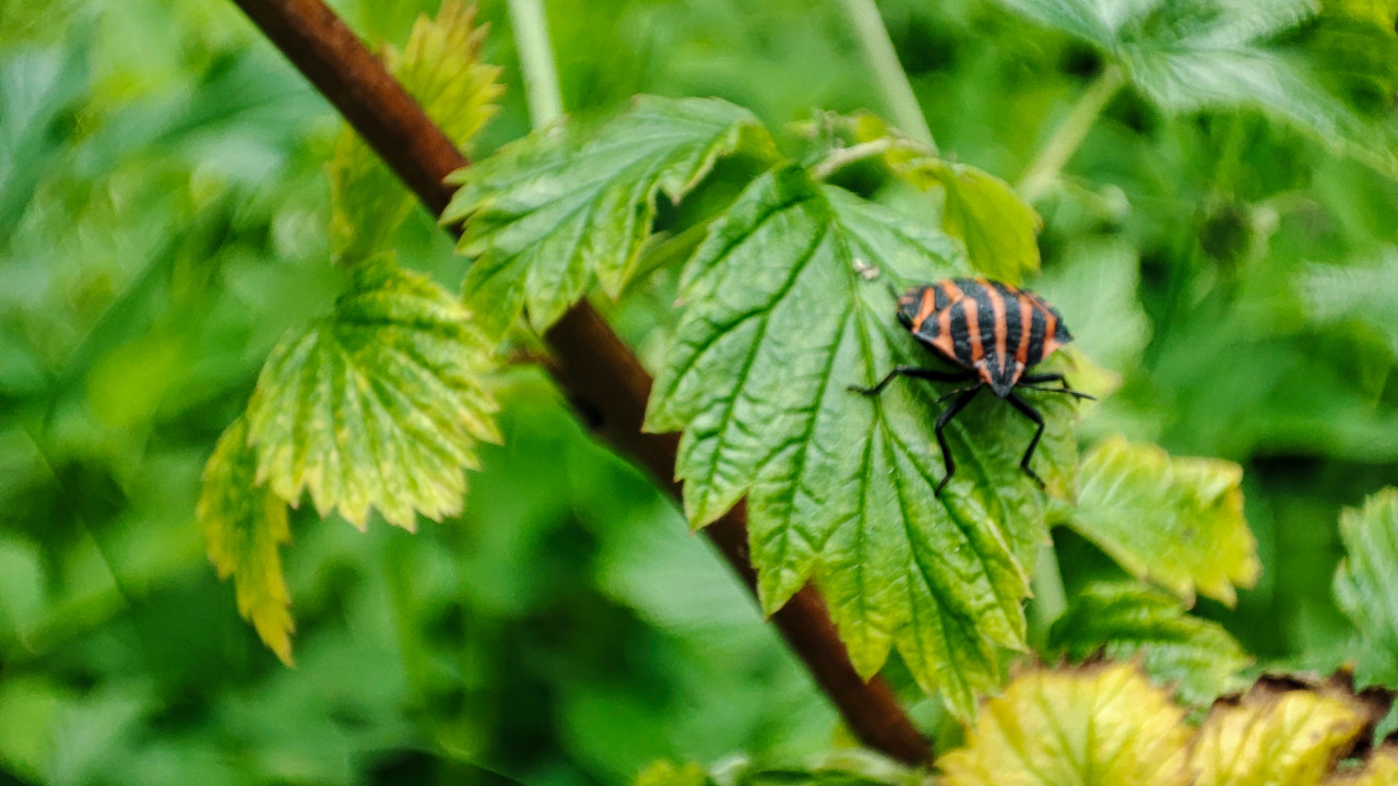 На зелёном листе рядом с коричневой веткой сидит клоп-щитник с контрастным чёрно-оранжевым полосатым панцирем. В кадре различимы ноги и общий силуэт насекомого, а поверхность листа показывает жилки, влажный блеск и зубчатый край. Окружающая листва и стебли уходят в размытие, создавая мягкий фон и подчёркивая рисунок на спинке. Фотография подходит для статей о насекомых и садовой фауне, иллюстраций к материалам по экологии и биологии, а также для карточек-определителей и учебных презентаций. Уместно для инфографики и учебных заданий.