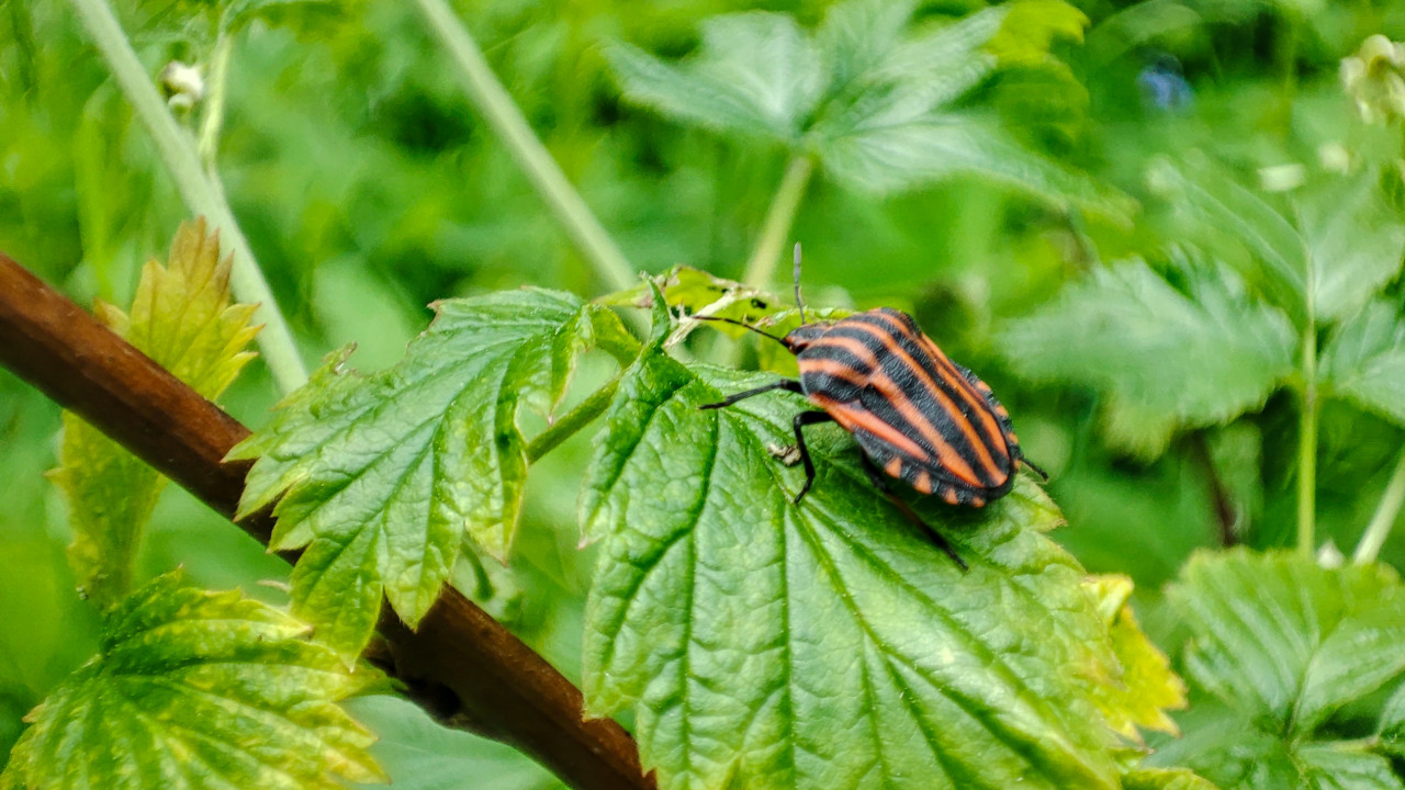 Клоп-щитник снят крупно: полосатое тело занимает заметную часть кадра и контрастирует с зелёным листом. Различимы сегменты панциря, чёрные ноги и усики; лист с выраженными жилками и зубчатым краем находится в фокусе, а дальняя растительность растворяется в размытии. Коричневая ветка проходит слева и задаёт направление композиции, усиливая ощущение глубины. Кадр подходит для публикаций о природе и насекомых, иллюстраций к материалам по энтомологии и охране биоразнообразия, а также для образовательных карточек, сайтов и буклетов о садовой фауне.