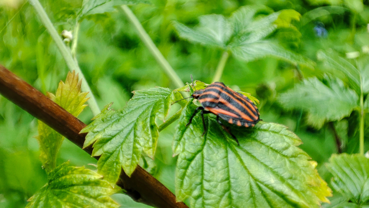 природа насекомые животный мир растения дикая природа биология энтомология биоразнообразие клоп клоп щитник полосатый щитник макросъёмка крупный план боковой ракурс лист растения зелёная листва природная среда ветка стебли растений фон размытый боке чёрно оранжевые полосы панцирь насекомого усики ноги экология луг сад микромир наблюдение натуральные цвета дневной светПохожие фотографии
