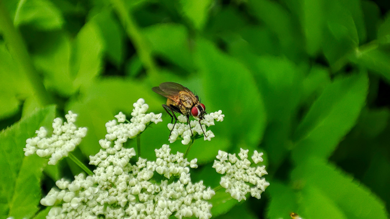 Муха с красными глазами на белых цветках зонтичного растения