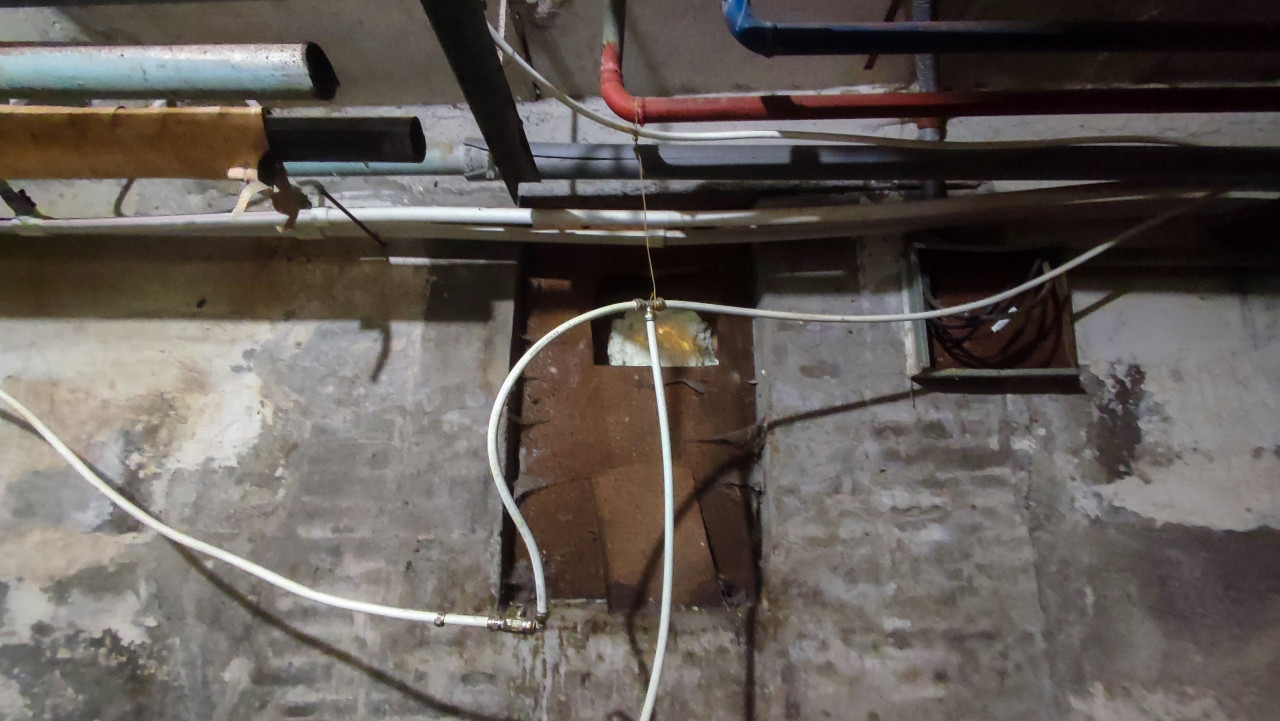 Интерьер технического помещения с грубой бетонной стеной: под потолком проложены трубы разного диаметра, местами видна старая изоляция и крепления. Через стену проходят белые кабели и шланги, один участок заведён в проём с тёмной нишей, рядом заметен вентиляционный канал или технологическое отверстие. На поверхности стены следы ремонта и пятна, освещение локальное. Фотография подойдёт для иллюстраций тем про инженерные сети, обслуживание дома, аварийные работы, электрику и эксплуатацию подвальных помещений.
