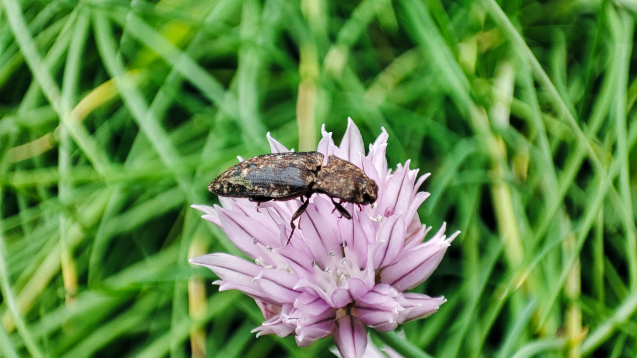 На снимке показан коричневый жук, сидящий на розовом шаровидном соцветии лугового растения. Хорошо видны вытянутое тело, надкрылья с пятнистой окраской и лапки, цепляющиеся за лепестки; вокруг соцветия заметны мелкие пыльники. Фон состоит из зелёной травы с размытыми линиями стеблей, что подчёркивает объект в фокусе. Съёмка выполнена на улице при дневном свете, с акцентом на текстуру насекомого и форму цветка. Фото может использоваться в материалах об энтомологии, насекомых лугов и макрофотографии природы.