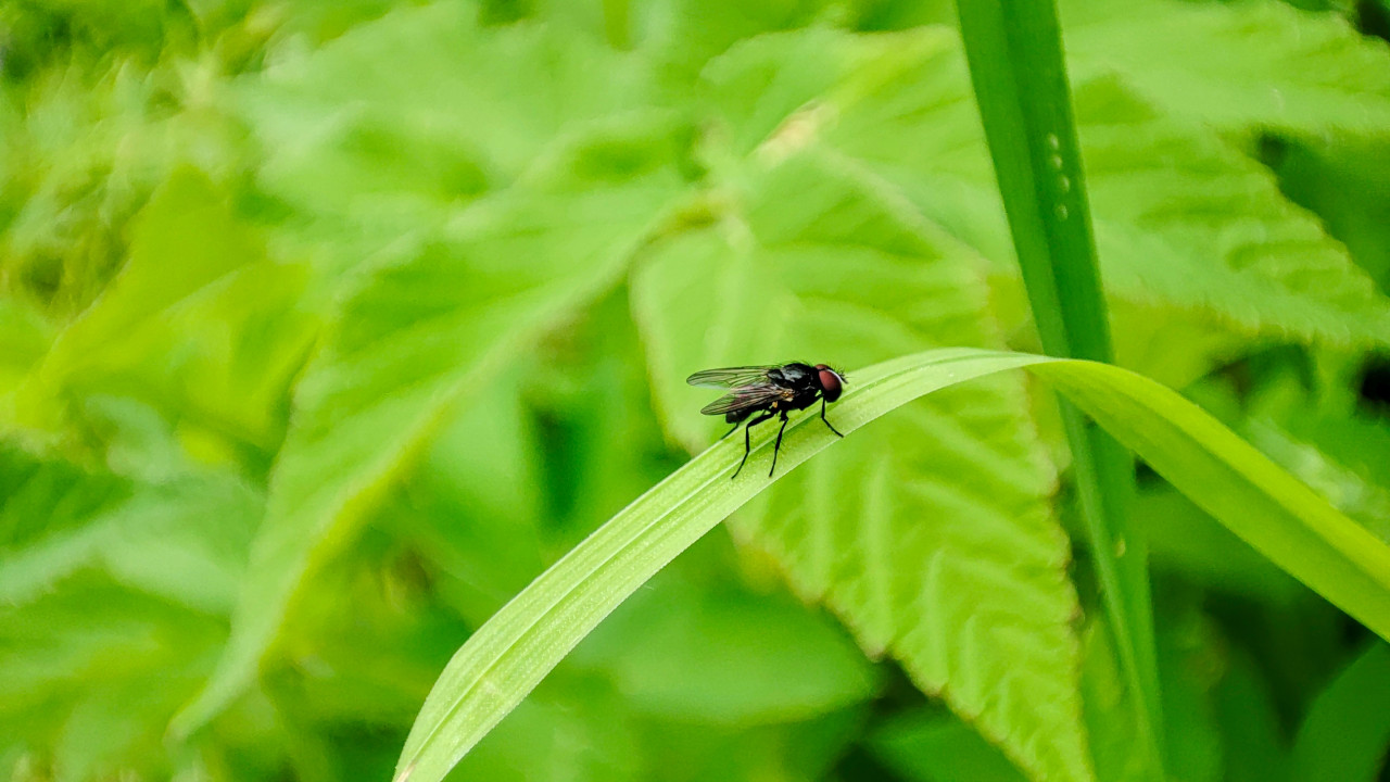 На фотографии крупным планом запечатлена муха, сидящая на изогнутом листе травы. В фокусе видны красноватые глаза, тонкие лапки, прозрачные крылья и вытянутое тёмное тело; лист имеет продольные жилки и светлую кромку. Фон состоит из размытых зелёных листьев и стеблей, что создаёт минималистичную композицию с сильным цветовым доминированием зелени. Съёмка выполнена на улице при дневном освещении, с малой глубиной резкости. Фото подойдёт для иллюстраций о насекомых, макрофотографии, природе и сезонной растительности.