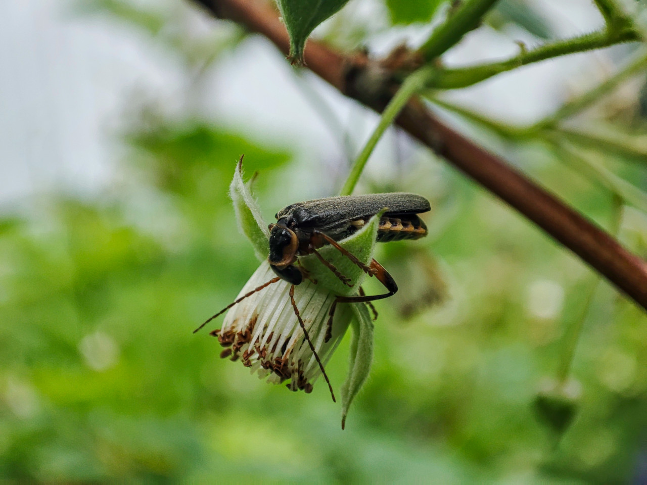 Сюжет макросъёмки: жук с тёмными надкрыльями лежит поперёк поникшего цветка малины, опираясь лапками на чашелистики и тычинки. В кадре видны тонкие усики, форма тела и рельеф надкрылий, а также детали цветка: светлые лепестки, множество тычинок и их пыльники. Сзади проходит ветка, фон мягко размытый и зелёный, без лишних объектов, что подчёркивает насекомое и растение. Естественный дневной свет, съёмка на улице в тёплый сезон. Использование: материалы о жизни насекомых в саду, биоразнообразии, опылении и агротематике; подходит для статей и иллюстраций к справочникам.