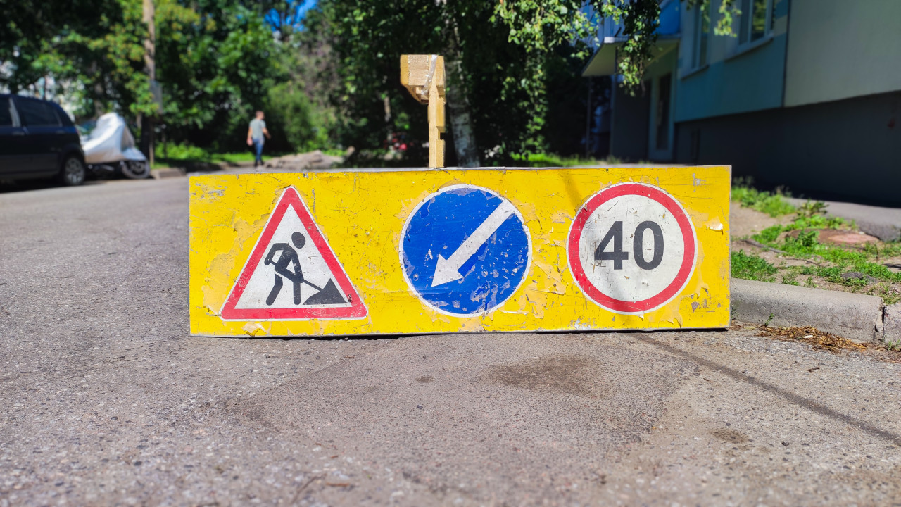 дорожный знак пдд правила дорожного движения безопасность дорожного движения организация движения уличная инфраструктура навигация направление движения ограничение скорости инфраструктура дорожное хозяйство безопасность дорожные знаки временные знаки дорожные работы ремонт 40 объезд стрелка предупреждение барьер ограждение желтый щит потертости износ асфальт бордюр двор жилой квартал коммунальные службы дорожная служба лето солнечный свет городская улицаПохожие фотографии