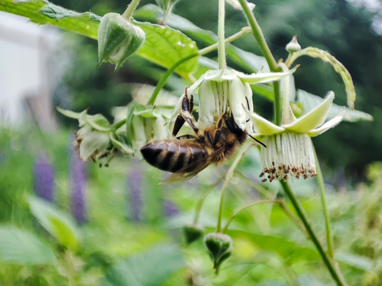 природа насекомые животный мир растения дикая природа биология энтомология биоразнообразие сад дача цветы цветение малина цветок малины ягодные культуры опылители медоносная пчела пчела перепончатокрылые сбор нектара пыльца опыление полосатое брюшко крылья насекомого тычинки чашелистики бутоны макросъёмка крупный план зелёный фон боке лето экологияПохожие фотографии