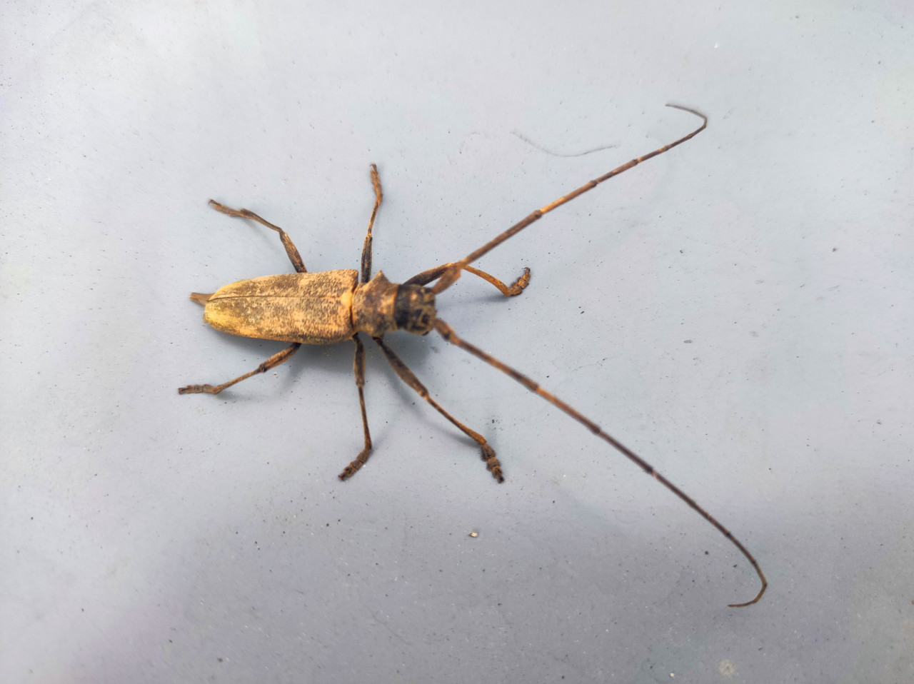 Крупный план жука-усача на гладкой светло-серой металлической поверхности, съёмка сверху. В кадре видны вытянутые надкрылья с пятнистым рисунком, голова и грудь, шесть лапок, длинные членистые усики, уходящие за пределы кадра, а также мелкая пыль и точечные загрязнения фона. Освещение формирует мягкую тень под телом насекомого и подчёркивает фактуру хитинового покрова. Фотография пригодится для статей и презентаций об энтомологии, наблюдениях за насекомыми в городе, определителях видов и образовательных материалах по биологии.