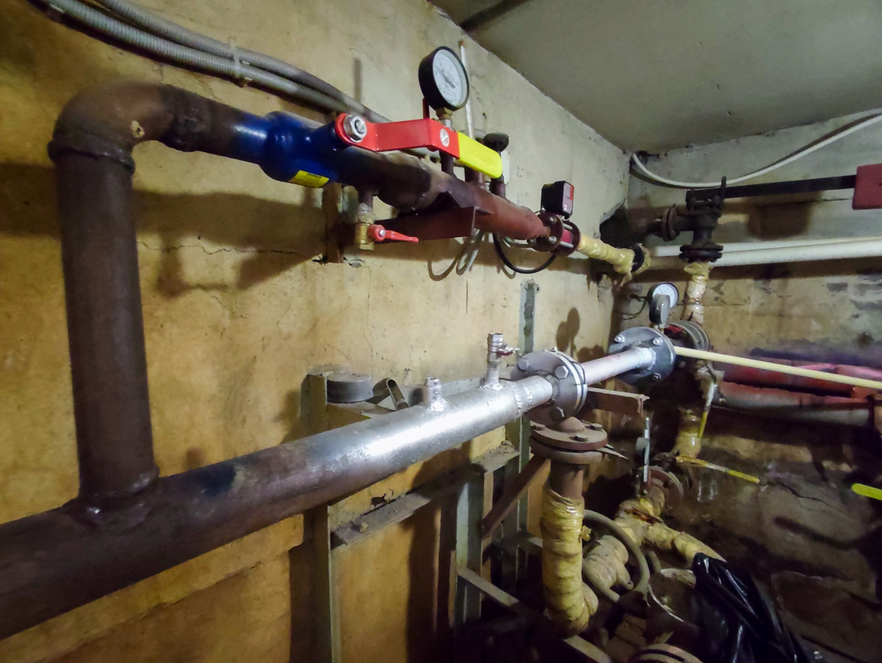 инфраструктура инженерные сети инженерные коммуникации коммунальные службы жкх технический подвал инженерное помещение трубопровод стальная труба шаровой кран рукоятка крана манометр давление измерительный прибор фланцевое соединение хомут крепление резьбовое соединение изоляция труб утеплитель техническое обслуживание ремонтные работы монтаж эксплуатация здания система отопления теплосеть индустриальный бетонные стены проводка безопасностьПохожие фотографии