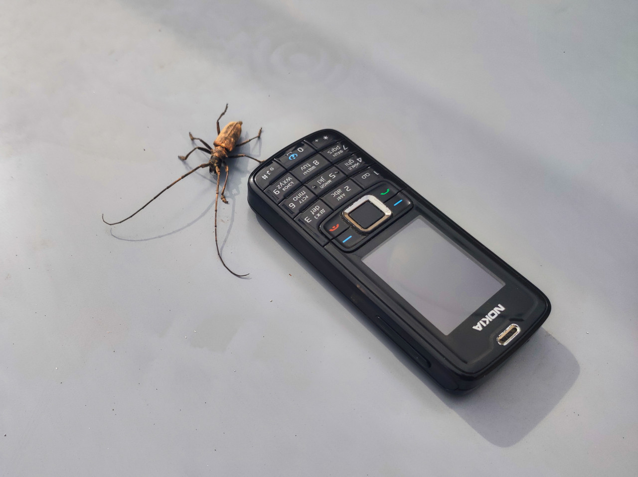 Кнопочный мобильный телефон Nokia лежит на светло-серой поверхности под углом, рядом расположен жук-усач. Камера фиксирует детали клавиатуры и боковые грани корпуса; экран выключен и отражает свет. Насекомое находится слева от телефона, заметны надкрылья, лапки и длинные усики, тянущиеся по поверхности и дающие тонкую тень. Фон без лишних предметов оставляет место для надписей и графики. Кадр подойдёт для иллюстраций о кнопочных телефонах, предметной съёмке, теме цифрового минимализма, а также для заметок о насекомых и городской природе.