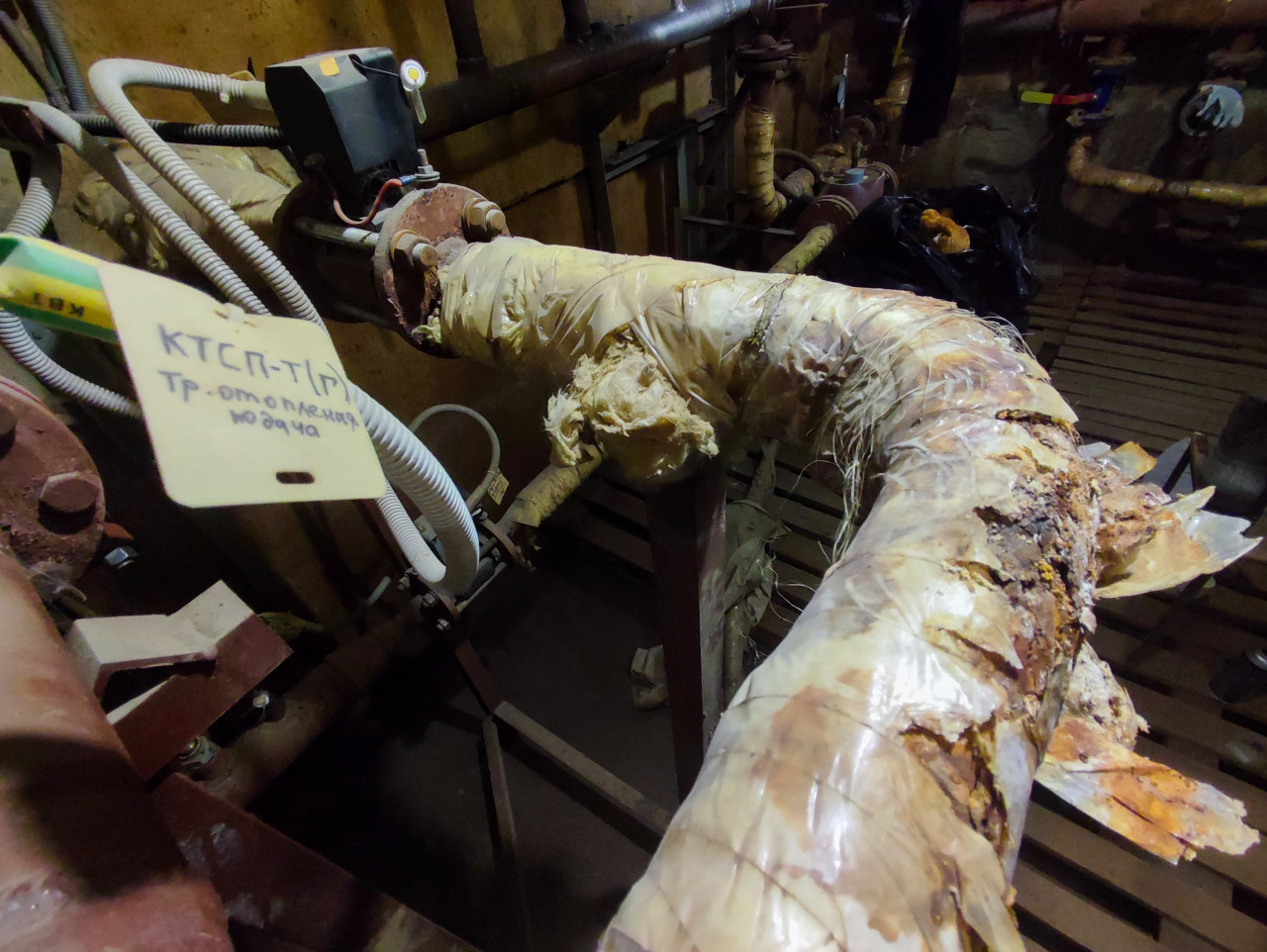 инфраструктура инженерные сети инженерные коммуникации коммунальные службы жкх промышленность система отопления теплотрасса внутри здания трубопровод поворот трубы теплоизоляция обмотка лентой разрушенная изоляция оголенный металл коррозия металла ржавые потеки фланец болтовое соединение регулирующая арматура электропривод клапана манометр проводка кабельные каналы технический подвал тепловой узел обслуживание оборудования аварийное состояние диагностика ремонтные работы эксплуатация инженерный осмотрПохожие фотографии