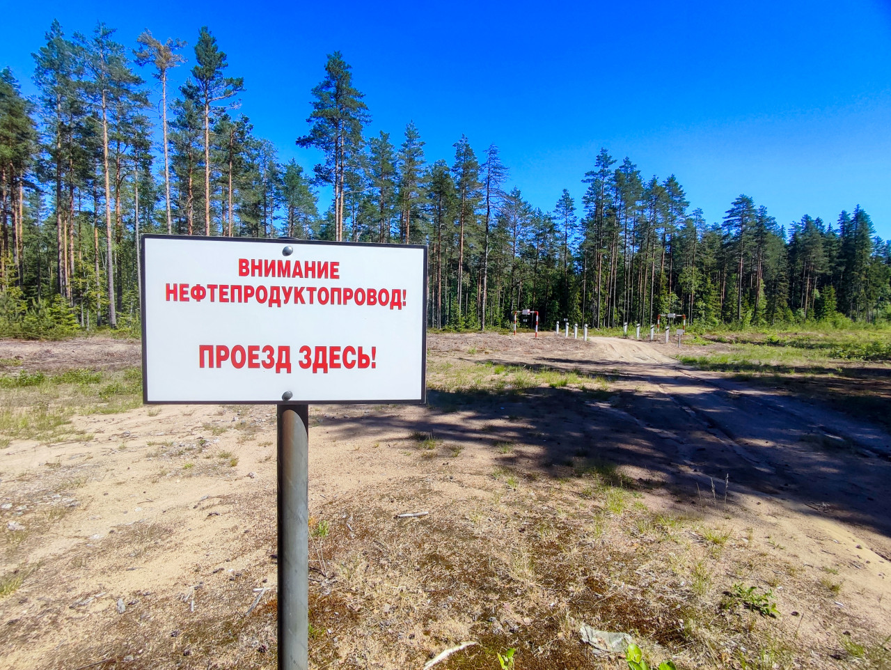 Табличка о нефтепродуктопроводе у грунтовой дороги в сосновом лесу