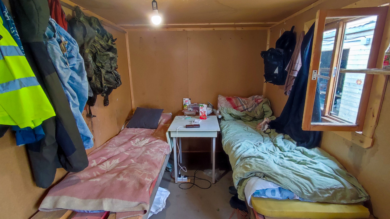 интерьер бытовка вагончик временное жилье жилье рабочих вахта спальное место кровать постельное белье одеяло подушка стол еда на столе удлинитель кабели электричество лампа одежда рабочая одежда сигнальный жилет рюкзак куртка хранение вещей маленькая комната окно открытая форточка бытовые условия стройка полевые работы временный бытПохожие фотографии