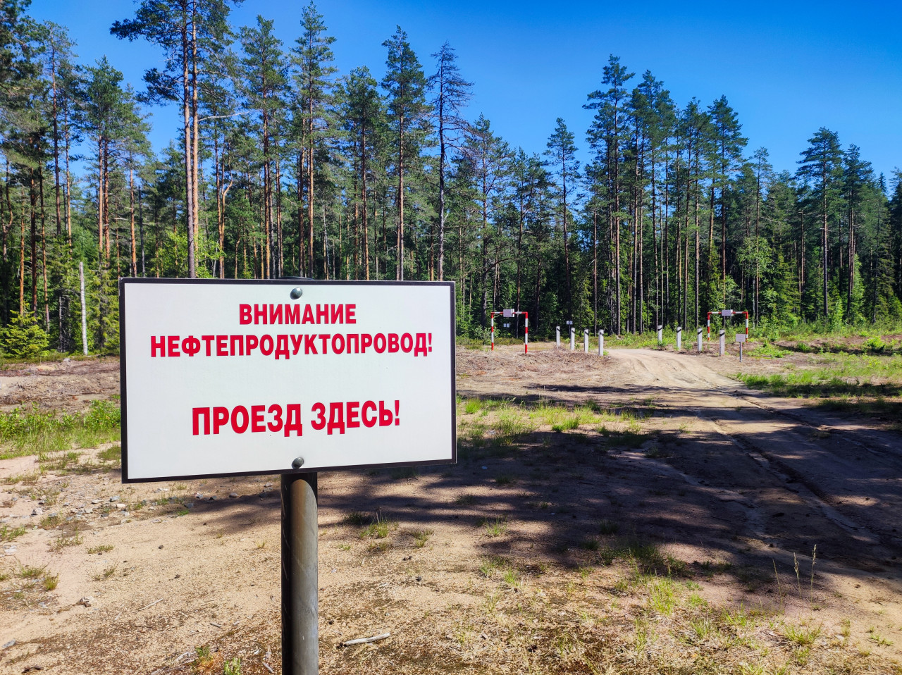 Предупреждающая табличка на лесной просеке: на белом щите красными буквами написано «Внимание нефтепродуктопровод! Проезд здесь!». Знак установлен у грунтовой дороги, ведущей через сосновый лес, по бокам видны столбики ограждения и рамные конструкции над проездом. Почва песчаная, местами открыта вырубка, вокруг растет молодая поросль и высокие сосны; погода ясная, дневной свет. Снимок подходит для тем промышленной инфраструктуры, охранных зон, навигации, экологии и правил безопасности на объектах трубопроводного транспорта.