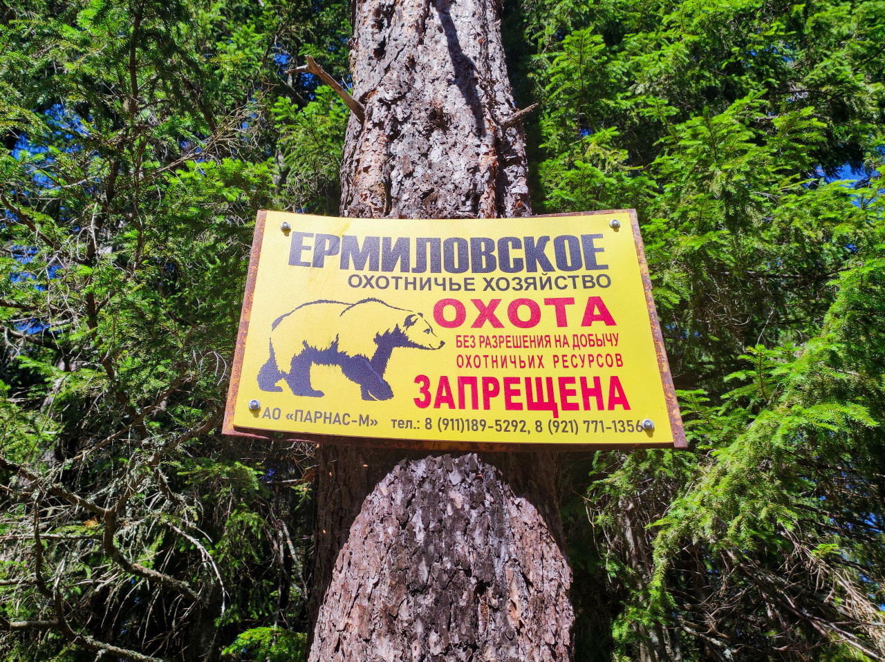 Предупреждающий знак на жёлтом фоне закреплён на грубой коре сосны и снят фронтально, без наклона. На щите читаются название «Ермиловское охотничье хозяйство», слово «охота» и крупная отметка «запрещена», рядом силуэт медведя; по краям видны крепёжные элементы. Сзади плотные еловые ветви формируют зелёную стену, местами просвечивает яркое небо. Освещение жёсткое, с резкими тенями, что характерно для полуденного солнца. Фотография уместна для новостей и справочных материалов о запретах, охотничьем законодательстве, навигации и безопасности в лесу.