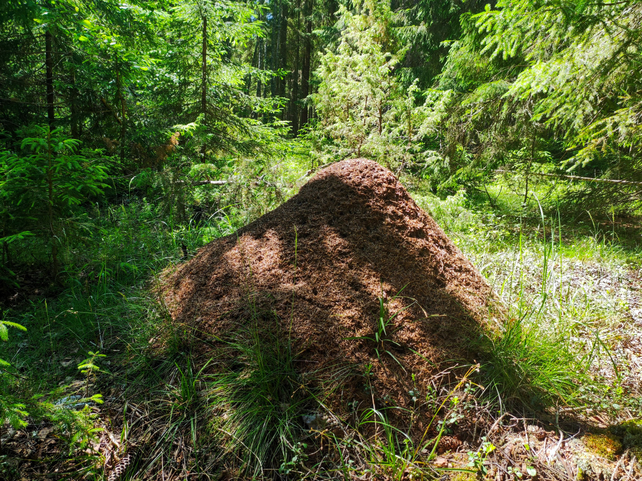 В центре кадра — высокий муравейник конусной формы, сложенный из сухой хвои и мелких веточек. По периметру растут травы и молодые хвойные деревца, на земле заметны участки мха и лесной подстилки; сквозь кроны елей и сосен пробиваются пятна солнечного света, создавая контраст тени и освещённых участков. Снимок выполнен днём в тёплый сезон по насыщенной зелени вокруг. Подойдёт для материалов об экологии леса, биоразнообразии, поведении насекомых и природных ландшафтах. Подходит и для иллюстрации лесных маршрутов, природных парков и полевых наблюдений.