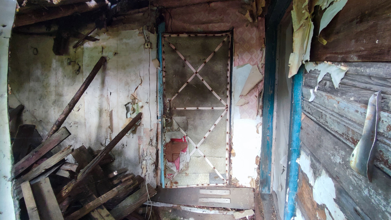 На снимке показан вид изнутри заброшенного деревянного строения: узкое помещение с повреждёнными стенами и осыпающейся отделкой. В центре кадра металлическая дверь с диагональными усилителями, вокруг обрывки обоев и штукатурки, местами видны оголённые доски и стойки. На полу лежат деревянные рейки и обломки, в углах скопившийся мусор. Справа на стене закреплена металлическая деталь, заметны следы ржавчины и выцветшая краска. Фото подходит для иллюстрации тем заброшенных интерьеров, ремонта, демонтажа и износа конструкций.
