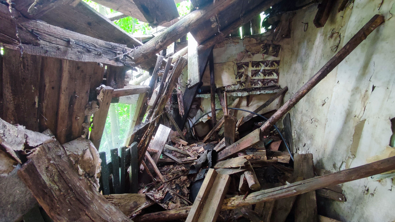 Обрушенный интерьер деревянного дома с разрушенной кровлей