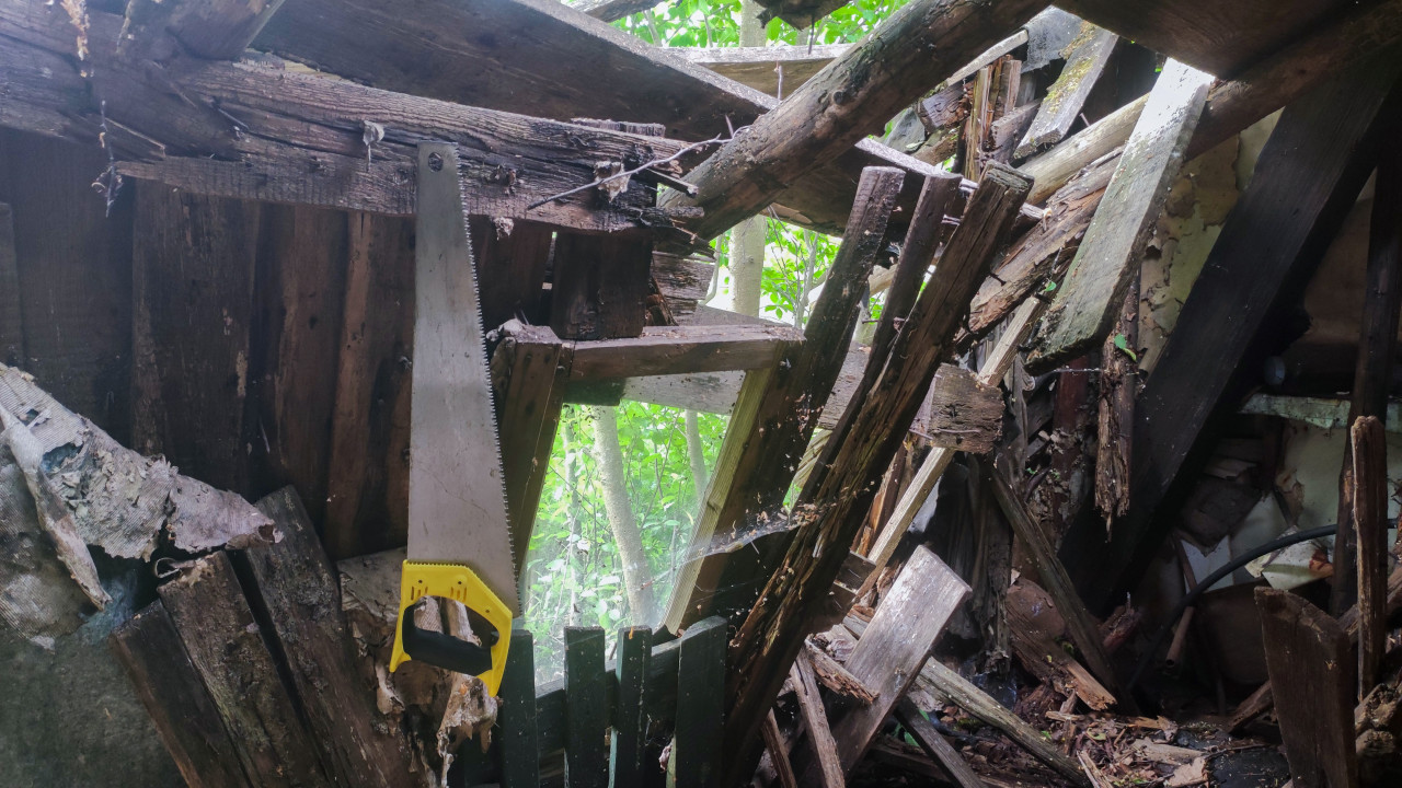 Фотография показывает внутреннее пространство старого деревянного дома в аварийном состоянии. В центре кадра — обвалившиеся балки и перекрытия, наклонённые доски и фрагменты стен. Сквозь проломы в крыше и стенах виден зелёный фон растительности снаружи. Пол покрыт строительным мусором и остатками конструкций. Объект выглядит нежилым и давно покинутым. Изображение подходит для иллюстраций тем, связанных с заброшенной недвижимостью, разрушением жилых домов, урбанистическими исследованиями и состоянием старого жилого фонда.