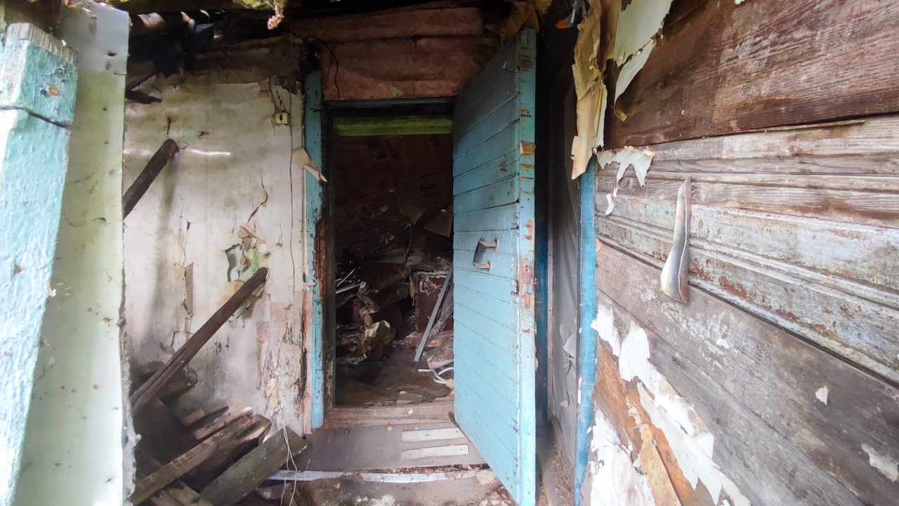 На изображении представлен внутренний вид заброшенного деревянного дома с акцентом на старую дверь, окрашенную голубой краской. Стены выполнены из досок и частично разрушены, видны следы гниения и механических повреждений. Пол и прилегающие помещения завалены деревянными обломками и строительным мусором. В помещении отсутствуют признаки эксплуатации. Фотография подходит для иллюстраций, посвящённых заброшенному жилью, состоянию старых домов, архитектурному упадку и процессу разрушения интерьеров.