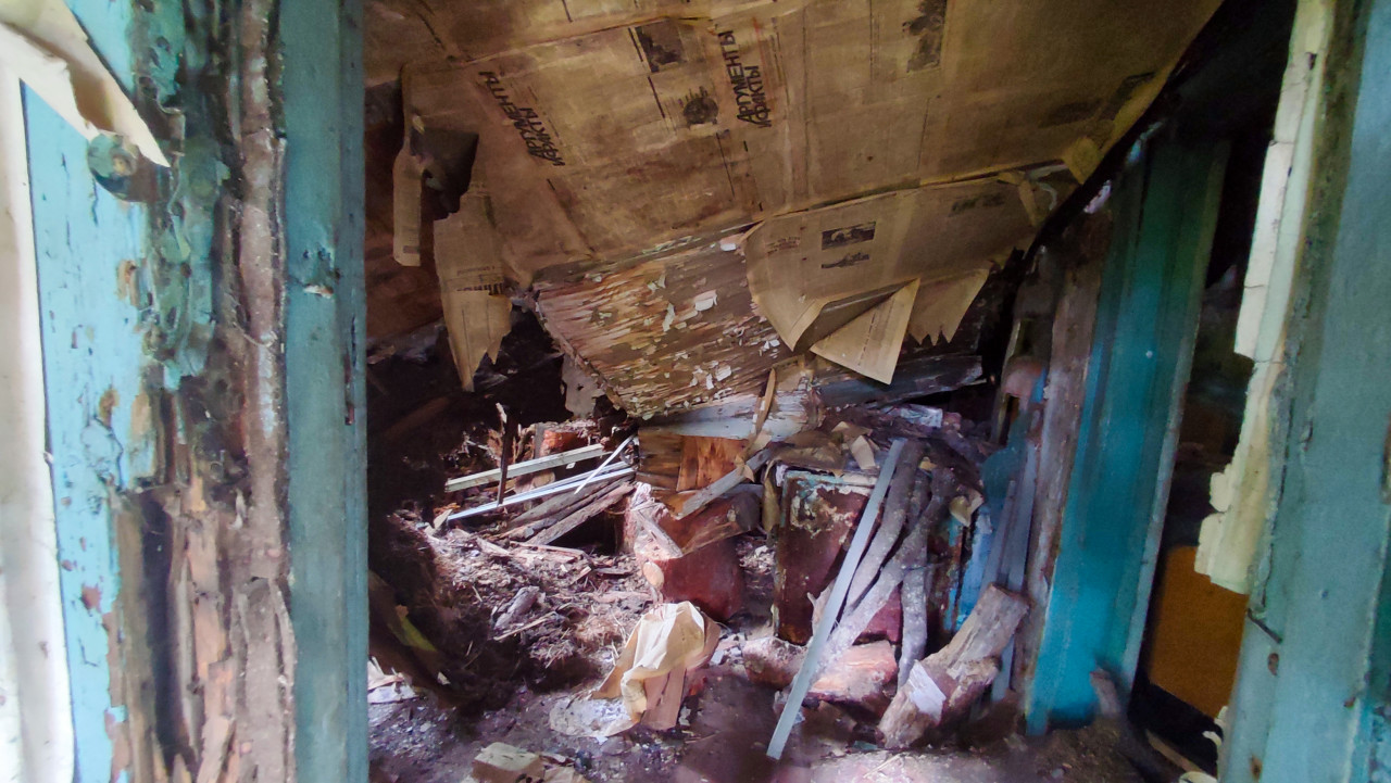 На фотографии изображена комната внутри заброшенного деревянного дома. Потолок частично обрушен, на полу лежат балки, доски и фрагменты строительных конструкций. Стены имеют следы сильного износа и разрушения, отделка практически утрачена. В помещении отсутствуют предметы быта, что подчёркивает его нежилое состояние. Фотография может использоваться в материалах о заброшенных интерьерах, аварийных зданиях, деградации жилых пространств и визуальной фиксации разрушенных домов.