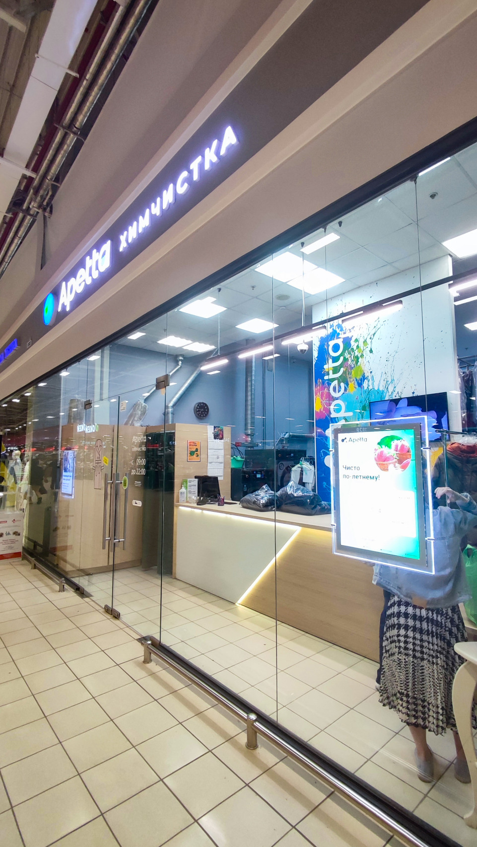 Витрина пункта Apetta химчистка за стеклянными дверями торгового центра
