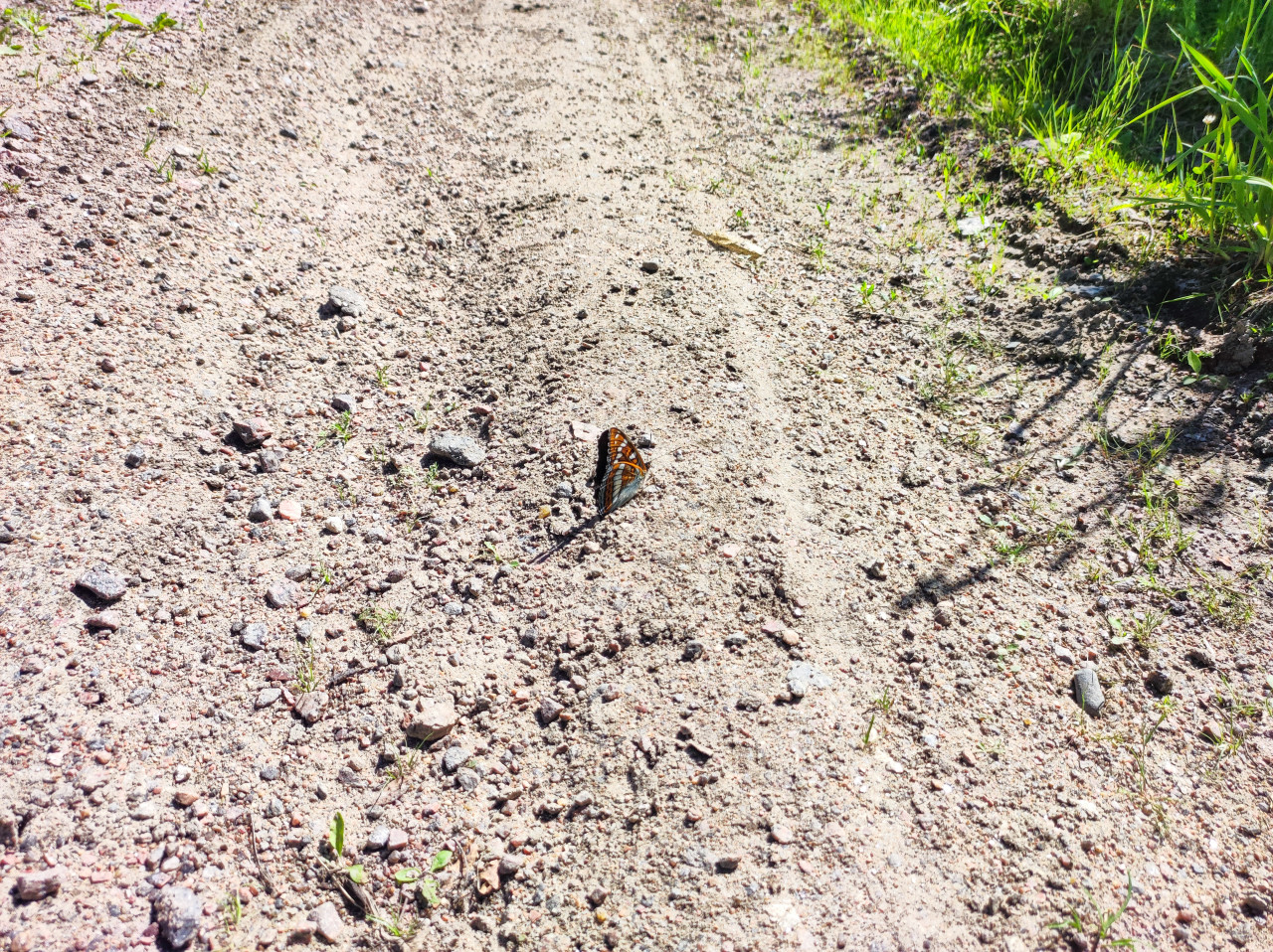 Бабочка в профиль на песчаной дороге с мелким щебнем и травой