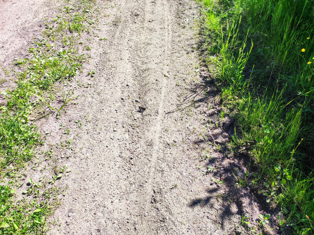 Летний дневной кадр с видом сверху на участок песчано-гравийной дороги. В центре кадра сидит небольшая бабочка, заметная на светлой пыльной поверхности между мелкими камнями и гранулами щебня. По краям дороги — зелёные обочины: слева низкая трава и сорняки, справа высокий травостой, местами видны тени от растений. На грунте различимы следы колеи и размытые дорожные полосы, встречаются отдельные листочки и веточки. Снимок можно использовать в материалах о природе, насекомых, экологии, прогулочных маршрутах и летнем сезоне.