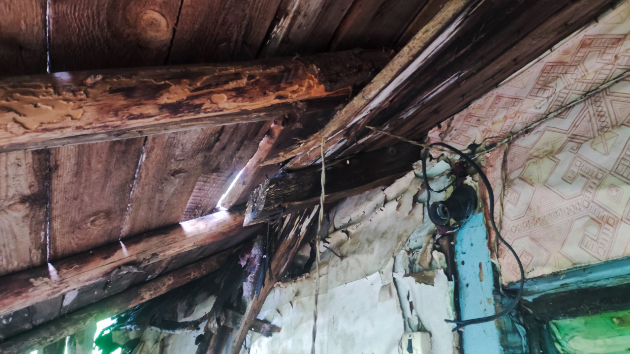 На снимке показан участок потолка и крыши внутри старого деревянного дома. Видны потемневшие доски обшивки, сгнившая балка и сломанные стропила, между которыми остаются щели с дневным светом. Справа заметны остатки обоев с геометрическим рисунком и фрагменты штукатурки, а также старая электропроводка с проводами и патроном. Кадр фиксирует состояние конструкций и отделки при длительном отсутствии ухода. Фотография подходит для иллюстраций о ветхом жилье, обследовании кровли, заброшенных интерьерах и теме безопасности зданий.