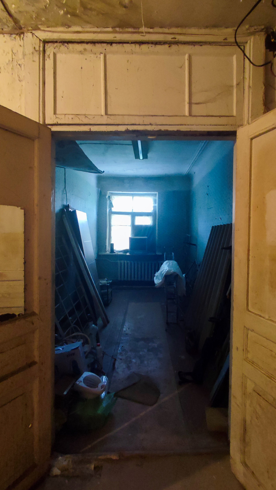 Съёмка внутри старого здания: через открытые двустворчатые двери видна узкая комната с окном и радиатором отопления под подоконником. Вдоль стен стоят листовые панели и доски, на полу пыль, мусор и обломки, у входа лежат предметы, похожие на сантехнику и бытовые ёмкости. На потолке заметна проводка и люминесцентный светильник, отделка местами потёрта. Естественный свет поступает только из окна, поэтому помещение выглядит полутёмным. Фото подходит для тем о ремонте, демонтаже и состоянии недвижимости.