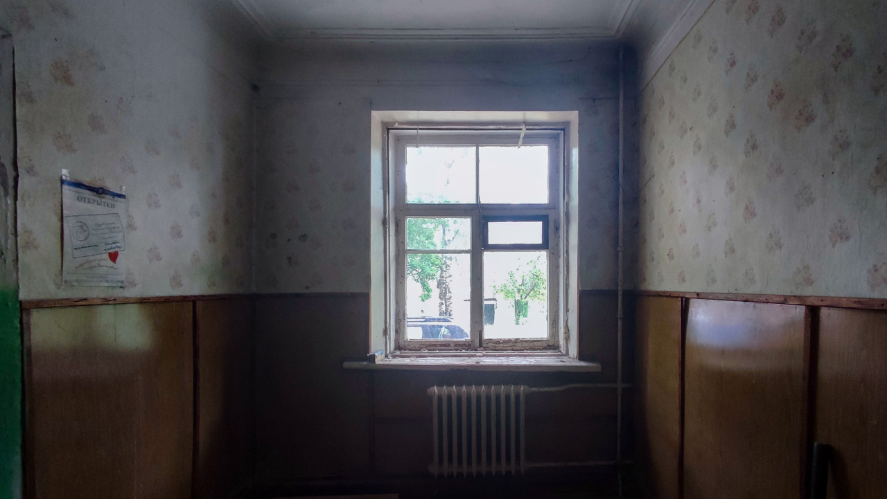 интерьер заброшенное здание старый дом ветхость аварийное состояние износ строительный мусор окно подоконник деревянные рамы стекло вид из окна деревья автомобиль радиатор батарея отопления трубы отопление помещение пустая комната старая отделка обои цветочный рисунок стеновые панели деревянная обшивка плакат объявление пыль потемнения дневной свет естественное освещение ремонт подготовка к ремонту недвижимость тихий интерьерПохожие фотографии