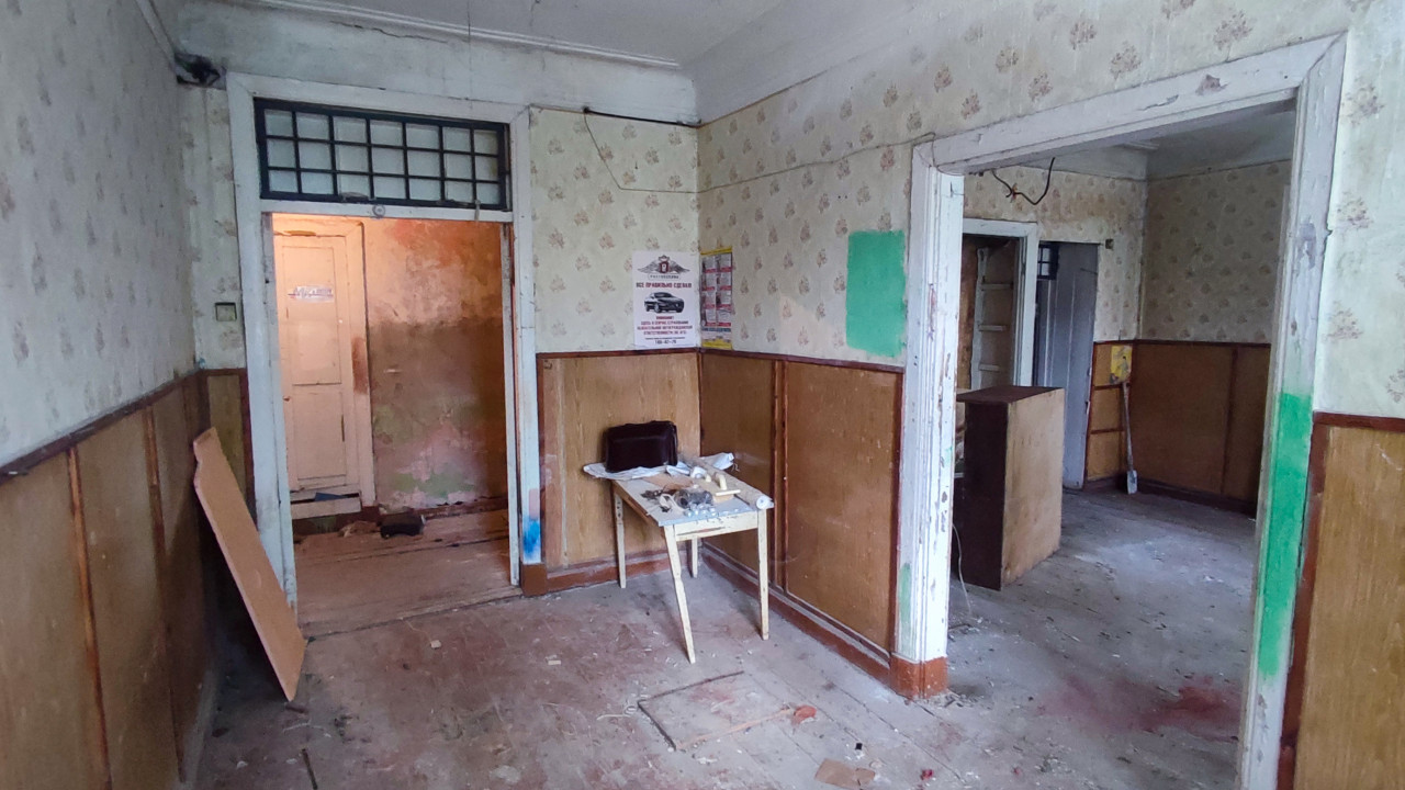интерьер заброшенное здание старый дом ветхость аварийное состояние износ строительный мусор пустое помещение старое здание обои стеновые панели деревянный пол дверной проём несколько комнат коридор перегородки открытые двери фрамуга решетка проводка свисающие провода стол рабочий стол бумаги инструменты портфель плакаты объявления пятна краски зелёная краска пыль ремонт реконструкция заброшенность дневной светПохожие фотографии