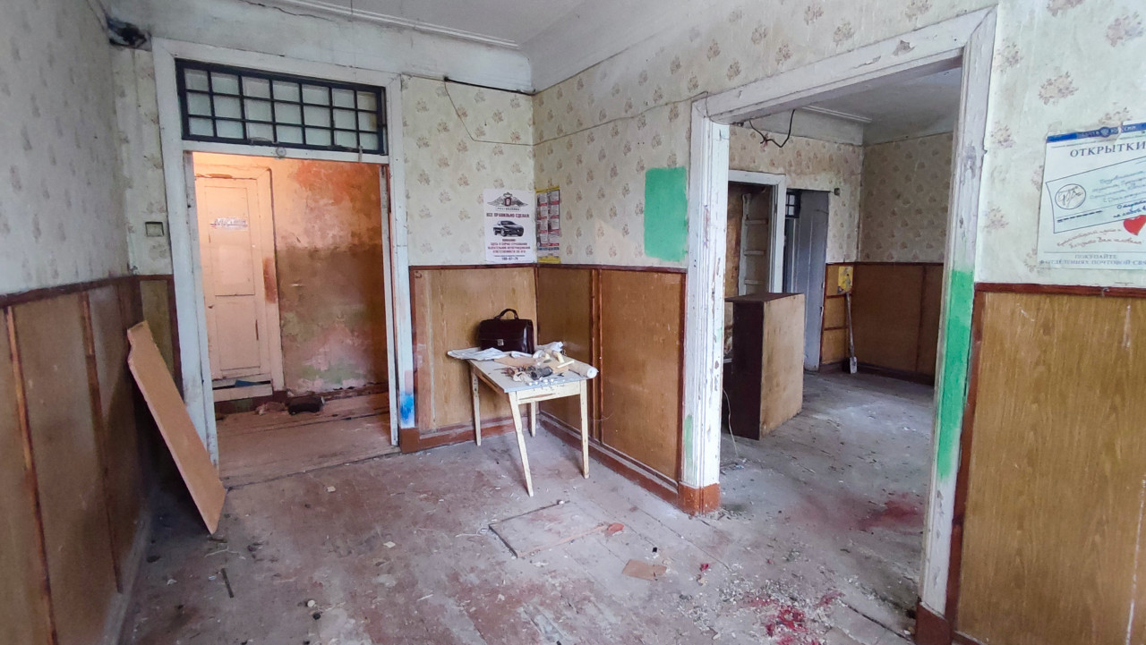 Интерьер старого помещения с обоями в мелкий цветок и деревянной панельной обшивкой стен. В центре стоит небольшой стол с бумагами и мелкими предметами, рядом лежит тёмный чемодан; на стене заметны рекламные плакаты, включая объявление про ОСАГО, а справа частично виден постер «Открытки». Дверные проёмы с фрамугой и стеклоблоками ведут в соседние комнаты, в глубине различимы стойка и пустые полки. На полу пыль, мусор и следы разрушения отделки. Использование: репортажи об урбанистике, заброшенных зданиях, интерьерах учреждений и социальная документалистика.