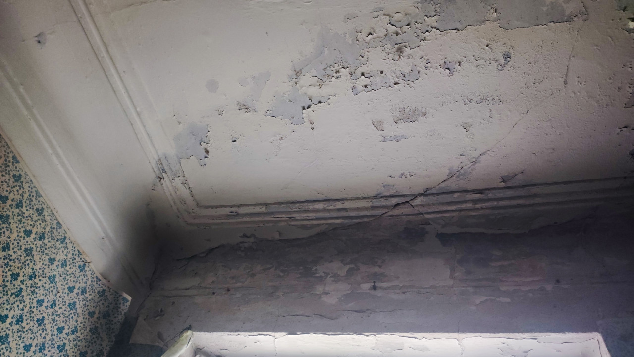 интерьер заброшенное здание старый дом ветхость аварийное состояние износ строительный мусор потолок угол комнаты трещины облупившаяся краска отслоение штукатурки осыпание дефекты отделки ремонт реставрация обследование здания строительная экспертиза декоративный карниз лепнина штукатурка фактура текстура крупный план следы ремонта неровности поврежденная поверхность обои верх стены старое покрытиеПохожие фотографии