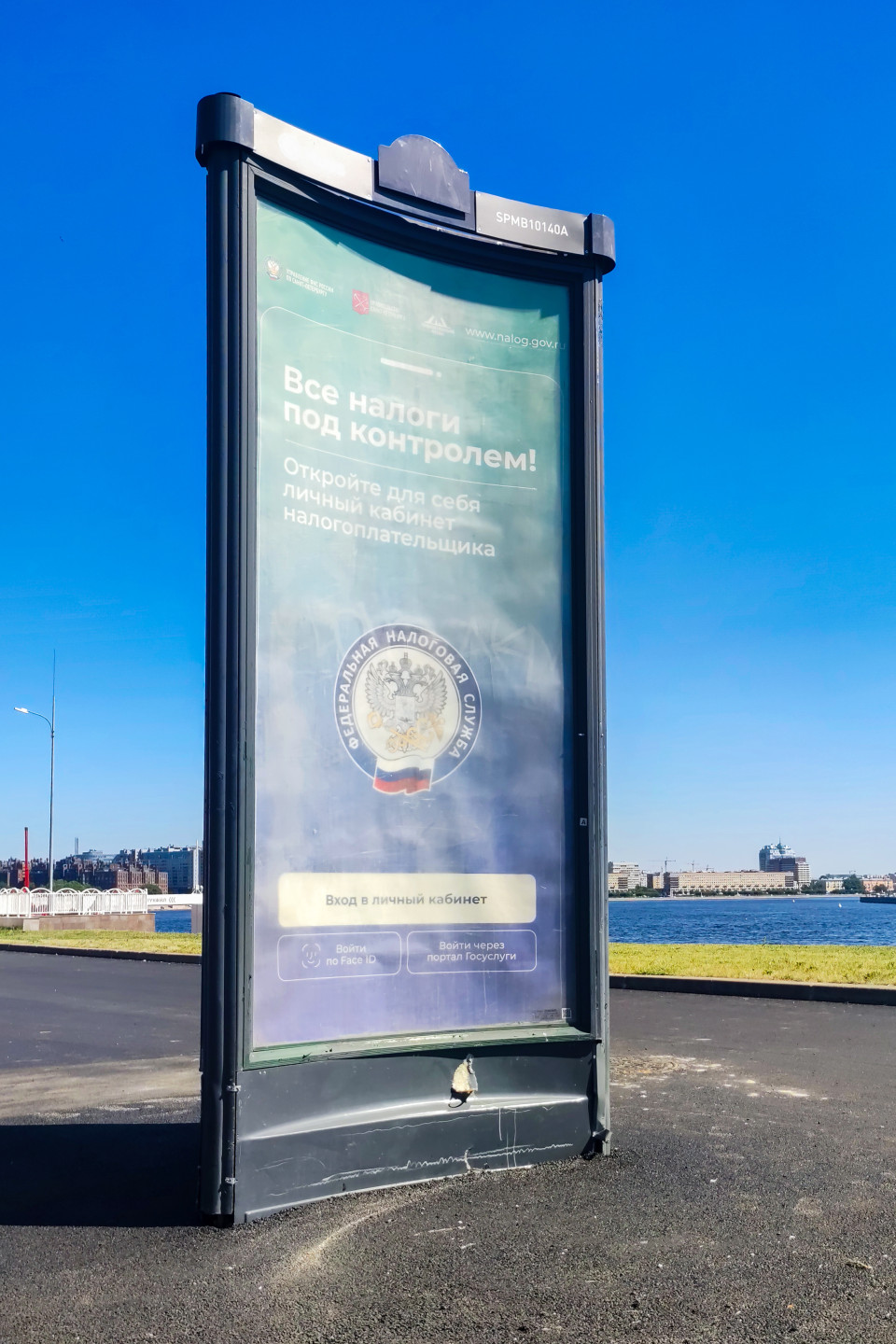 город улица городская среда городская инфраструктура наружная реклама рекламный носитель рекламный щит маркетинг Санкт Петербург Нева набережная уличная реклама рекламный стенд пилон плакат Федеральная налоговая служба ФНС налоги налогоплательщик личный кабинет госуслуги nalog gov ru информационная кампания социальная реклама берег вода лето синее небо стекло пыль износ общественная информация коммуникацииПохожие фотографии