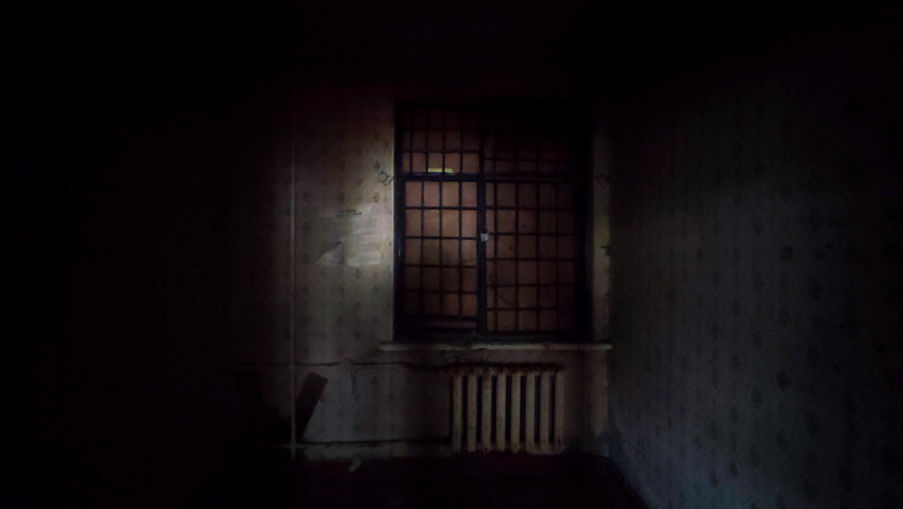 Окно с решёткой и радиатор, снятые через тёмный проём в заброшенной комнате