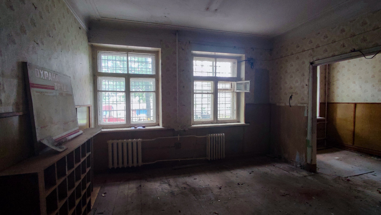 Общий вид заброшенной комнаты: два окна с металлическими решётками пропускают рассеянный дневной свет, под подоконниками стоят радиаторы и проложены трубы отопления. На стенах обои с мелким цветочным рисунком, нижняя часть отделана панелями; по полу деревянные доски с мусором и пылью. Слева тумба с ячейками и прислонённый щит/стенд с крупной надписью «Охрана труда». Справа дверной проём ведёт в соседнее помещение с иной отделкой стен. Использование: сюжеты о состоянии зданий, ремонте, коммунальной инфраструктуре и документальной съёмке интерьеров.