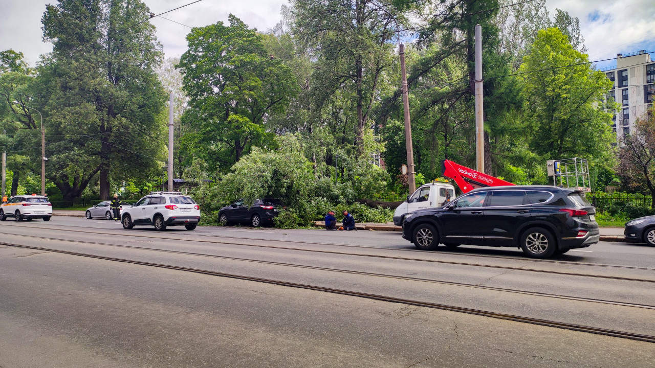 город улица трамвайные пути трамвайные рельсы контактная сеть упавшее дерево завал на дороге повреждение автомобиля аварийная ситуация ликвидация последствий аварийные службы коммунальные службы спецтехника дорога трафик автомобили обочина провода поваленные ветки ствол завал рабочие спецодежда инструмент автовышка подъёмная платформа рабочая корзина безопасность движения зелёная зона парк деревья облачное небоПохожие фотографии