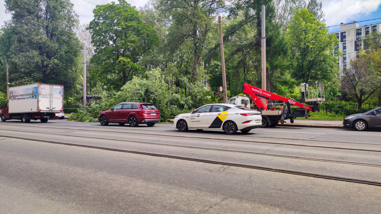 город улица трамвайные пути трамвайные рельсы контактная сеть упавшее дерево завал на дороге повреждение автомобиля аварийная ситуация ликвидация последствий аварийные службы коммунальные службы спецтехника дорожное движение автомобили грузовик такси Яндекс Go провода опоры ветки завал у обочины аварийные работы автовышка подъёмная платформа рабочая корзина кран манипулятор безопасность движения зелёная зона парк деревья дневной свет облакаПохожие фотографии