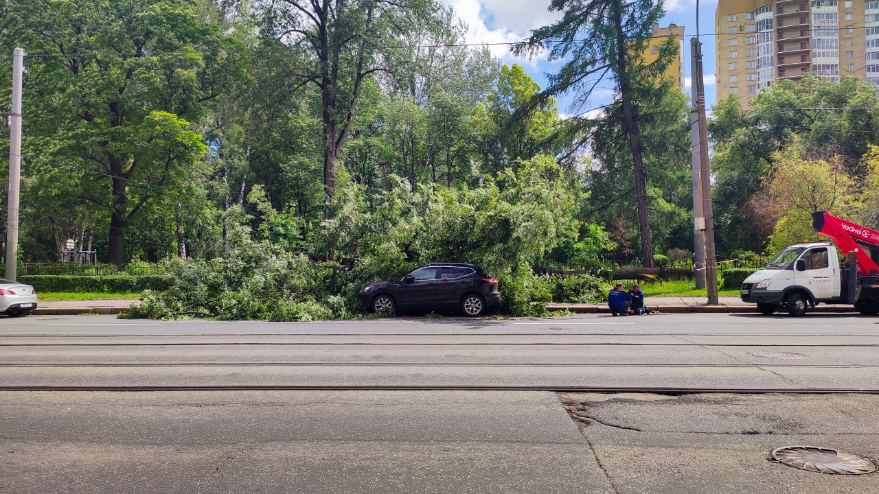 город улица трамвайные пути трамвайные рельсы контактная сеть упавшее дерево завал на дороге повреждение автомобиля аварийная ситуация ликвидация последствий аварийные службы коммунальные службы спецтехника дорога асфальт опоры провода ветки листва завал на тротуаре дерево на автомобиле припаркованные машины рабочие спецодежда аварийные работы подъёмная стрела городская инфраструктура зелёная зона деревья жилые дома дневной свет облакаПохожие фотографии