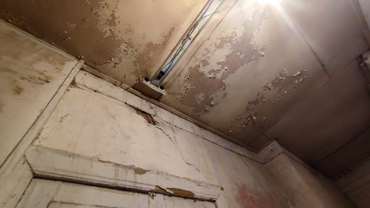 интерьер заброшенное здание старый дом ветхость аварийное состояние износ строительный мусор потолок светильник люминесцентный светильник лампа дневного света освещение проводка кабели электрика крепёж отслаивающаяся краска шелушение пятна трещины швы следы сырости дефекты отделки старое помещение дверной проём наличник повреждения техническое состояние обследование ремонт реконструкция урбекс документальная съёмкаПохожие фотографии