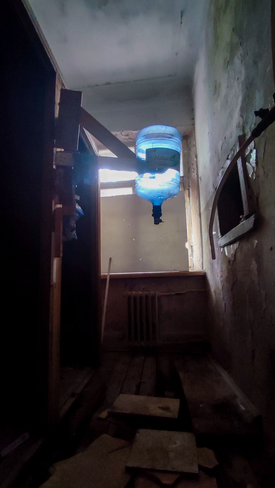 В кадре узкое пространство внутри старого здания: пол из деревянных досок местами провалился, лежат листы и обломки. На уровне глаз подвешена перевёрнутая бутыль от кулера с водой на самодельном деревянном кронштейне; виден кран/насадка внизу. В глубине проёма окно даёт сильный контровой свет, под ним установлен радиатор отопления. Справа на стене заметен полукруглый проём или ниша, отделка вокруг повреждена и покрыта пятнами. Снимок подходит для темы временных бытовых решений на объектах в ремонте. Использование: иллюстрации о стройплощадках, быте рабочих, ветхих интерьерах и урбан-репортажах.