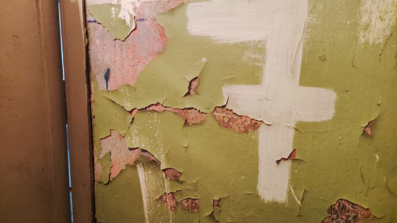 Крупный план стены с сильно повреждённым слоем краски. Виден зелёный и розоватый нижний слой, многочисленные сколы, трещины и отслоения покрытия. Поверхность стены демонстрирует следы старых ремонтов и длительного воздействия времени. Съёмка выполнена в помещении при естественном освещении, акцент сделан на фактуру и состояние материала. Фотография может использоваться в публикациях о состоянии интерьеров, подготовке к ремонту, фактурах строительных материалов и визуальных образах износа в архитектуре.