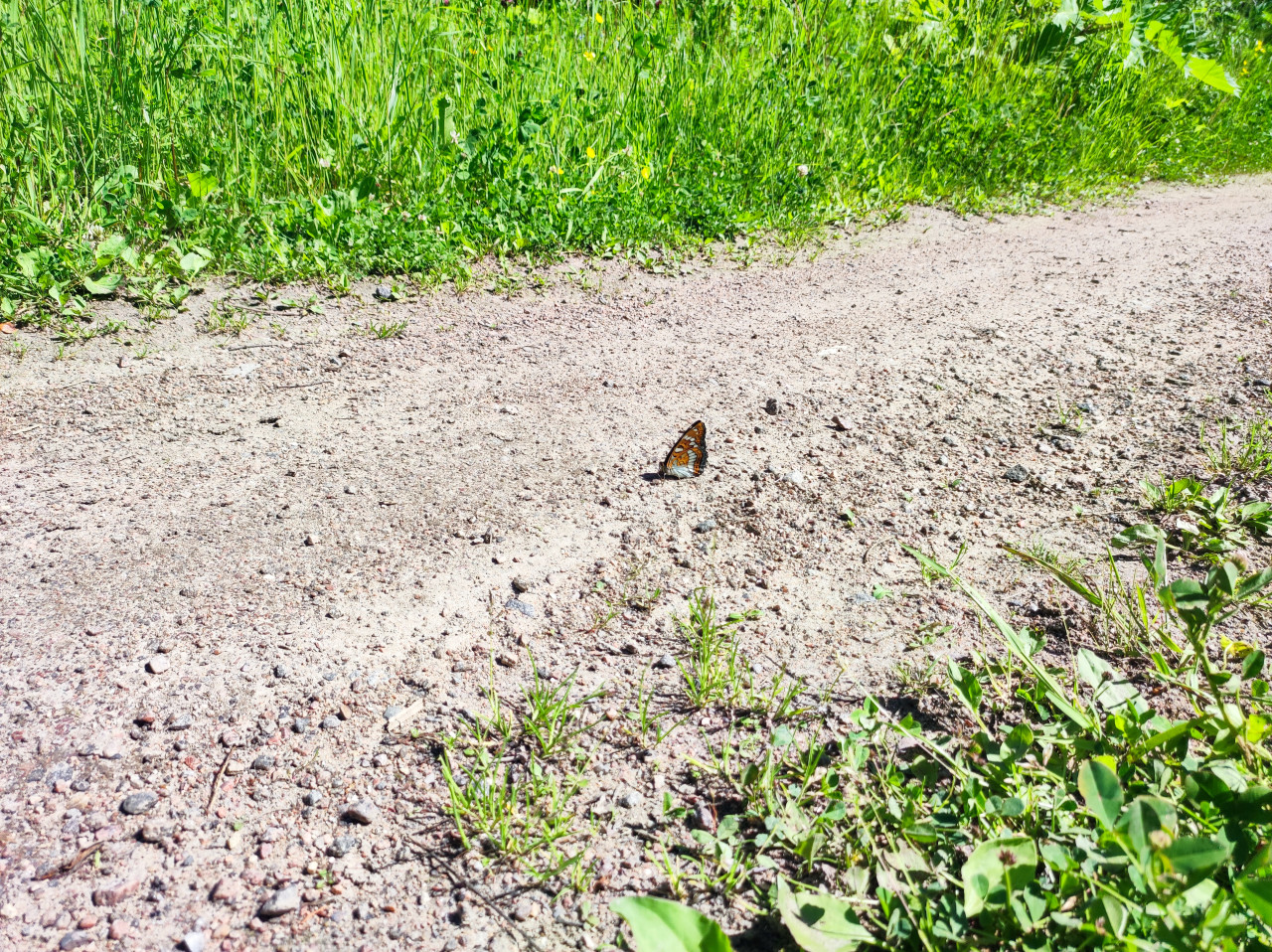 Бабочка на грунтовой дорожке рядом с полосой яркой зелёной травы