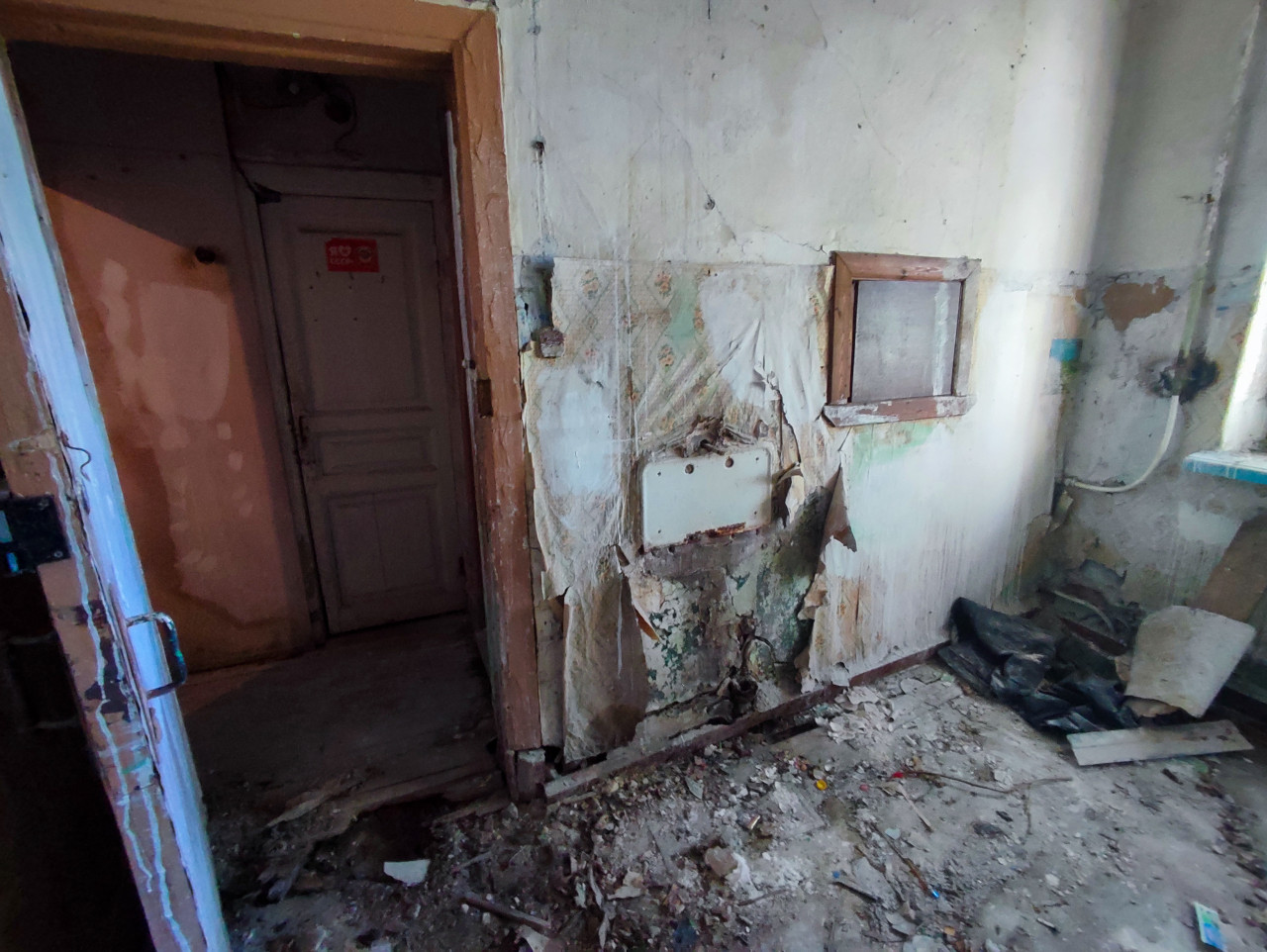 Внутри старого помещения видна стена с обрывками обоев и следами сырости, местами оголённая штукатурка и трещины. Слева — дверной проём с деревянной коробкой и дверь в соседнее тёмное помещение, на полу слой строительного мусора, пыли и обломков. На стене закреплён старый щиток/панель и небольшая рамка, справа — окно с подоконником, рядом проходят провода и трубки. В углу лежат листы чёрного материала и обломки. Фото подходит для тем о заброшенных зданиях, обследовании перед ремонтом, демонтаже и восстановлении помещений.
