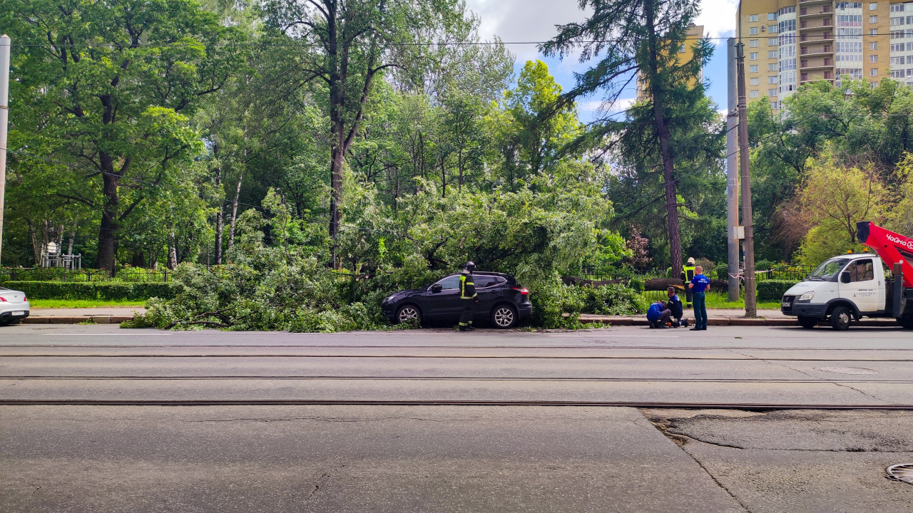 Расчистка поваленного дерева у трамвайных путей и повреждённый автомобиль у бордюра