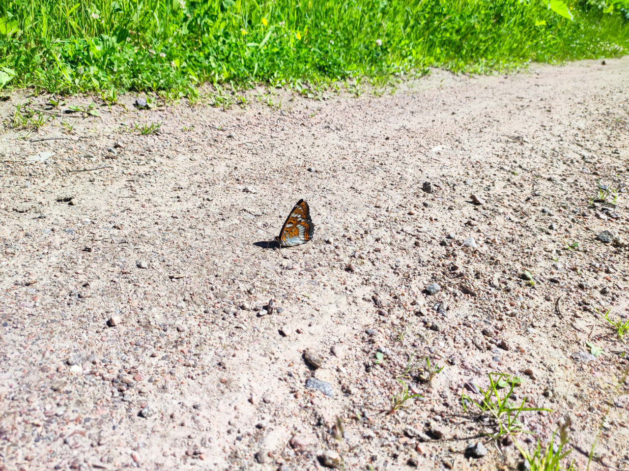 природа насекомые животный мир растения дикая природа биология энтомология насекомое бабочка крылья рисунок крыльев лето солнечный день тень на земле грунтовая тропа песок гравий щебень камни текстура поверхности сухая почва обочина зелёная трава луговые растения естественная среда макро крупный план экология биоразнообразие наблюдение за природой прогулкаПохожие фотографии