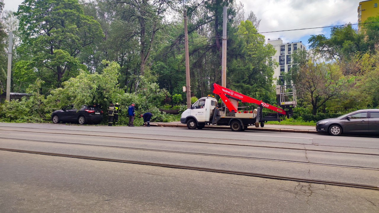 город улица трамвайные пути трамвайные рельсы контактная сеть упавшее дерево завал на дороге повреждение автомобиля аварийная ситуация ликвидация последствий аварийные службы коммунальные службы спецтехника автовышка рабочая платформа выносные опоры грузовик с краном аварийная бригада расчистка распил веток бензопила повреждённый автомобиль припаркованный кроссовер дорожное движение проезжающий автомобиль зелёная зона парк деревья жилые дома городская инфраструктура последствия непогоды сильный ветер безопасностьПохожие фотографии